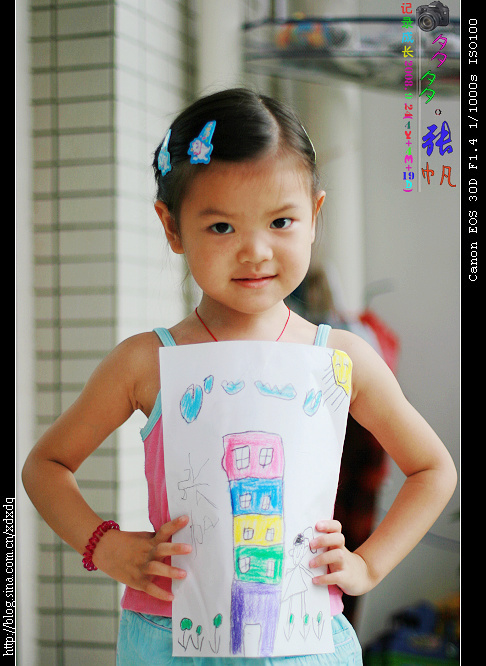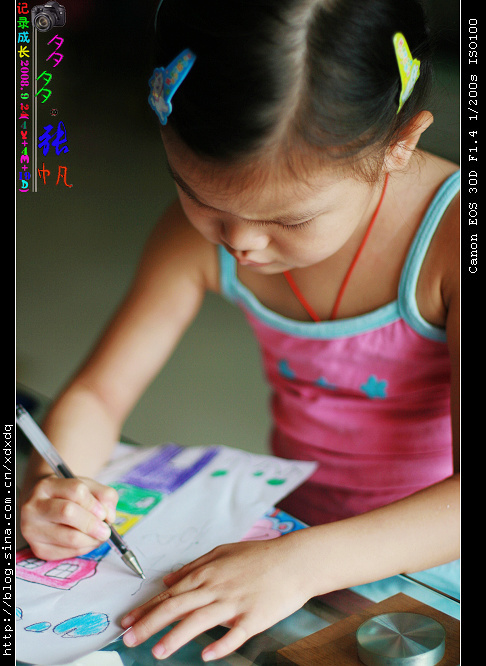 名字是今天早上让小多自己写的,以后每画好一幅画都要求她自己写上名字。