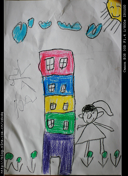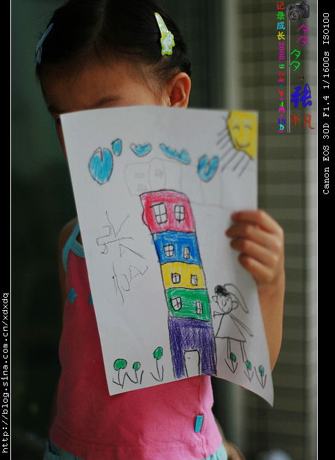 昨晚小多说老师要求小朋友回家后画个房子的画,那好啊,找了张A4纸用夹板夹好就让她趴在床上画了,开始画的横的,后来觉得画不下,就反过来重新画了,多妈继续回饭厅吃饭,没想到过了会小多大哭着跑出来了,怎么了怎么了?夹子把画弄皱了!终于听清楚了,赶紧抱着小多进卧室看,原来夹板上的夹子太重了,小多夹不起来,所以就把纸头的上檐弄皱了一点,再看画呢,已经画好轮廓了,那重新画一张么?不!那怎么办呢,多妈只好放弃手中的肥蟹,陪着丫头到房间继续画画去了,安抚小多的同时打开电脑滋滋有味地看起了《越狱》,还没看几分钟呢,小多突然把涂好颜色的楼房再次展现在了多妈的眼前,啊,真是眼前一亮啊,还有个展开笑颜的黄太阳呢,真是可爱啊。恩,如果不是那个皱,和边上被多妈慌乱中粘上的蟹油,那可真是一幅好干净的画。小多又画了个小姑娘在房子旁边,说是自己,还问多妈知道为什么一个胳膊那么短么,多妈想不出来,多把自己的胳膊肘一弯,哦,原来是这样啊。这两天上海暴热,多妈又迷上了《越狱》,于是就把小多安在大房间开空调一起睡了,小多也是听到这个才转泣而笑的,呵呵。于是这个晚上,多妈欲罢不能地占着电脑,多爸就和小多哈哈笑着看《快乐向前冲》,故事也不讲喽,腐败一家子,呵呵。