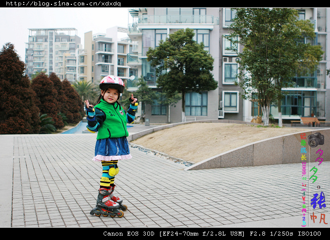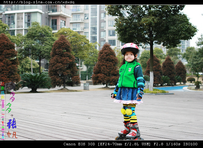 这几天多一直说自己的轮滑技术进步好多,已经超过豆豆了,多妈将信将疑,尽管豆豆比多小而且比多后有轮滑鞋,但就多妈对多的了解,应该还不会比小男孩更大胆,但还是说:“好的,周六你滑给妈妈看吧”。今儿周六,天气不错,小多说:“妈妈,你不是说要看我轮滑么?”好啊,果然,一到楼下,多就哧溜一下滑到前面去了,真是“出脚不凡”啊,多妈自觉放弃跟她比赛了,现在用的24-70重镜头也没办法跟着她跑了,就找个安全角落用变焦头拍吧,好在小多总是围着多妈转悠着滑。练习够了就再带着她到处晃悠,走到有楼梯的地方,多妈尝试放手让小多自己走,先是个有扶手的小桥,多扶着桥栏走过了,后来的楼梯没有扶手,多张开双臂也成功走过了,相信多来几次小多就会熟练自如了。路遇一陌生老年男,笑呵呵地问着这个小姑娘多大啦很象妈妈呀啥啥啥的,最后来了句“你这个镜头可以拍得很宽是吧?”哈哈,其实这才是上前搭讪的主要目的吧,不过多妈也说不出啥来,就恩啊哈的笑笑完事了,这个镜头是比较拉风了点。