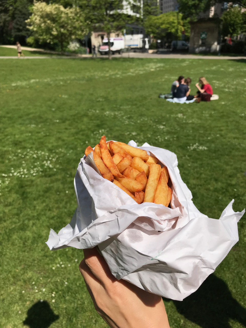 布鲁塞尔堪称国宝级的Maison Antoine薯条店,每天都是你来我往,为的便是那个经典味道。看着外焦里嫩、色泽金黄,入口更是酥软、芳香四溢。草坪上坐了好多人,人手一包薯条,就着暖阳吃吧!