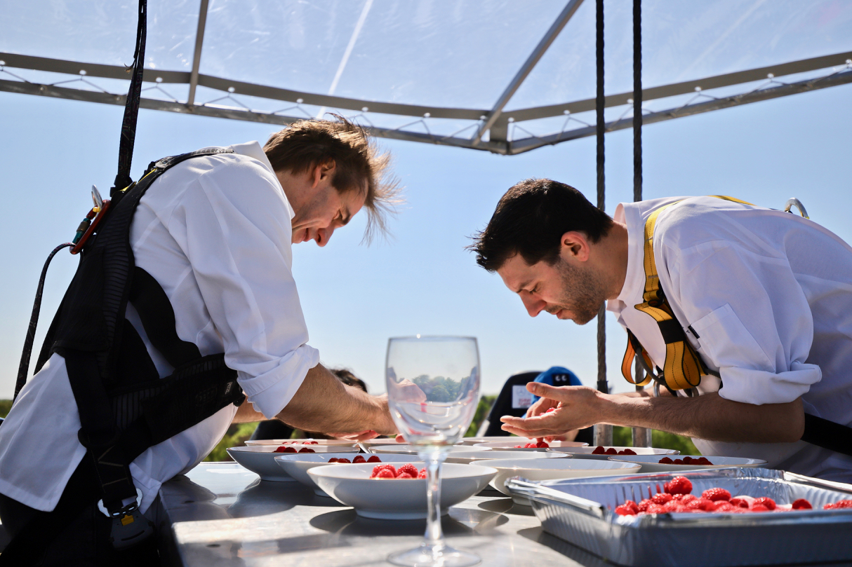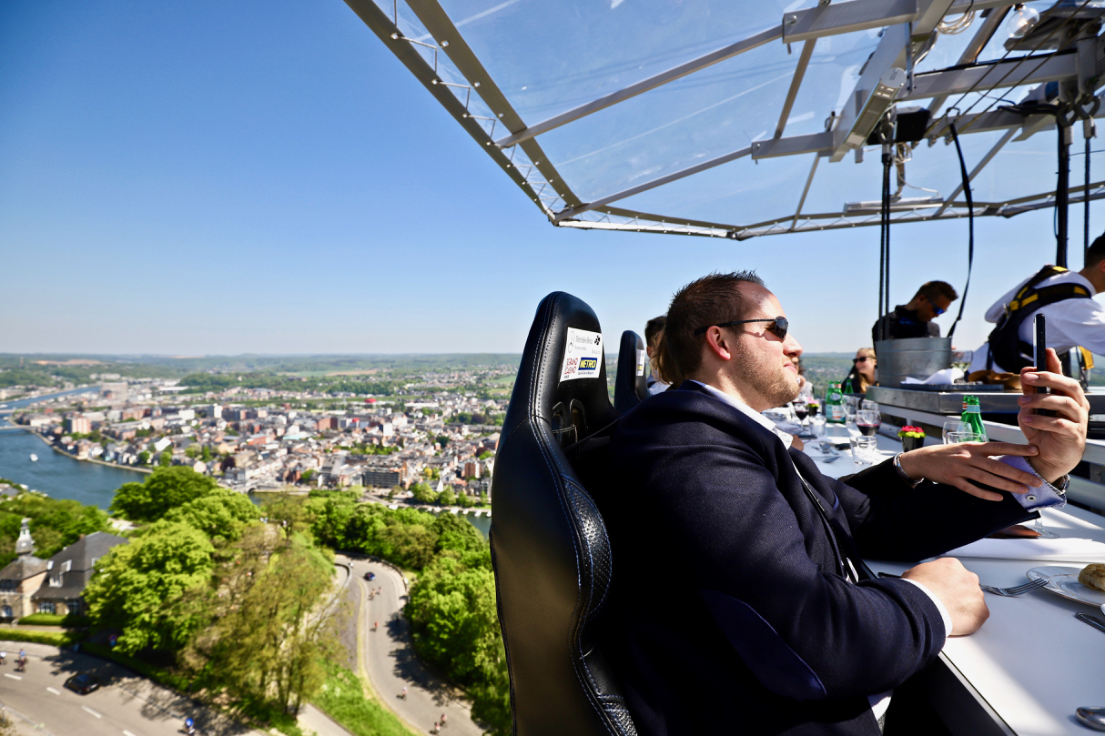 这项体验完全是靠吊车吊上去,脚下完全悬空,起保护的只有椅子上的安全带。悬停在距地面50米的高空中,名厨现场制作美味佳肴,比利时葡萄酒、头盘、主菜、甜点,一个也不能落下。清爽的微风吹在脸上,舒适极了。那慕尔城便在自己的脚下,360度无死角浏览城市美景,饕餮美味的同时尽享视觉盛宴。