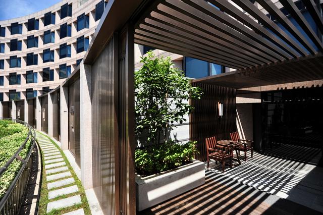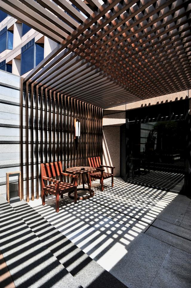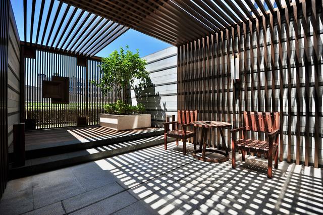 这个酒店设计绝了,我住在杭州君悦酒店的三层,这里巧妙地做出了空中庭院,阳光起时,那些条格既可遮阳,又在院子里面绘出了图画。