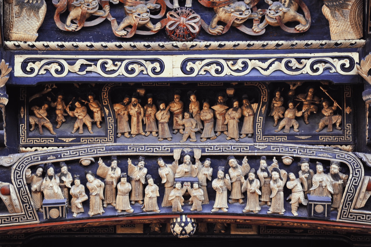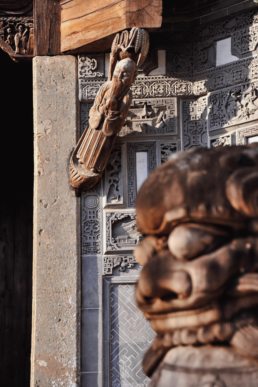 而古戏台的绝妙之处在于其富丽堂皇,以及雕有大量戏文故事和吉祥图案的梁柱,郭子仪上寿、曹孟德大宴铜雀台均在其中。