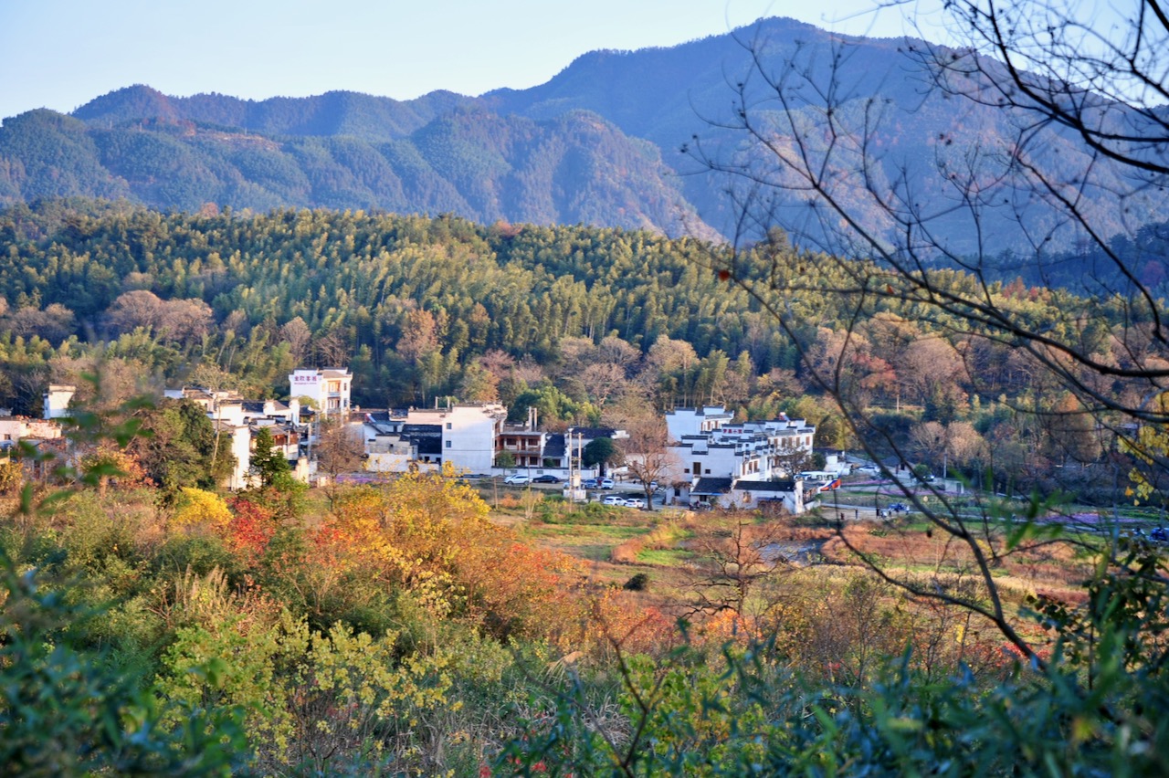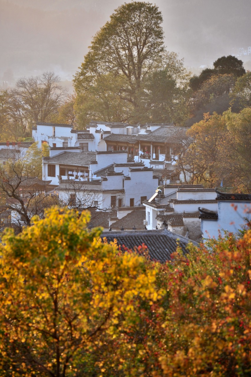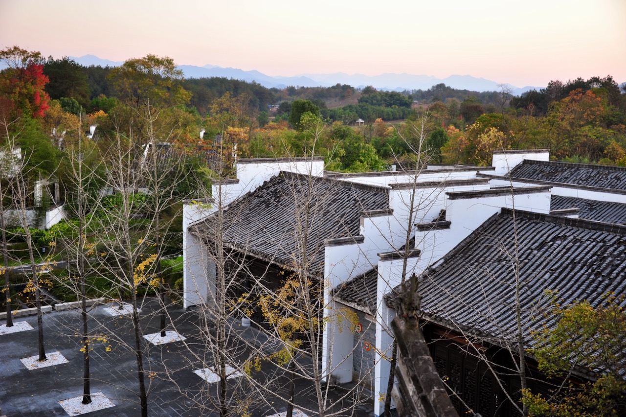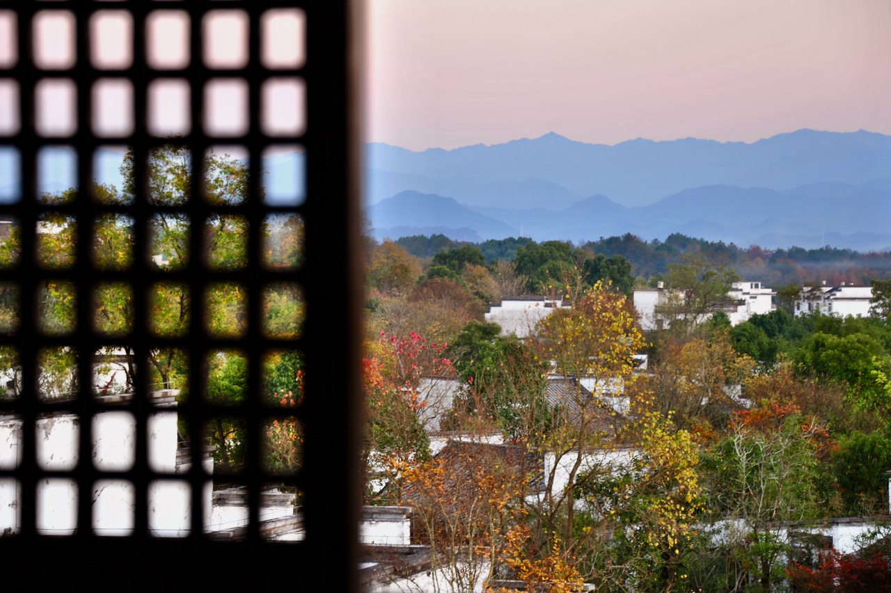 夕阳西下,登上阁楼,远山虚无缥缈,尽染的层林一片金黄,黄山雨润涵月楼尽收眼底。