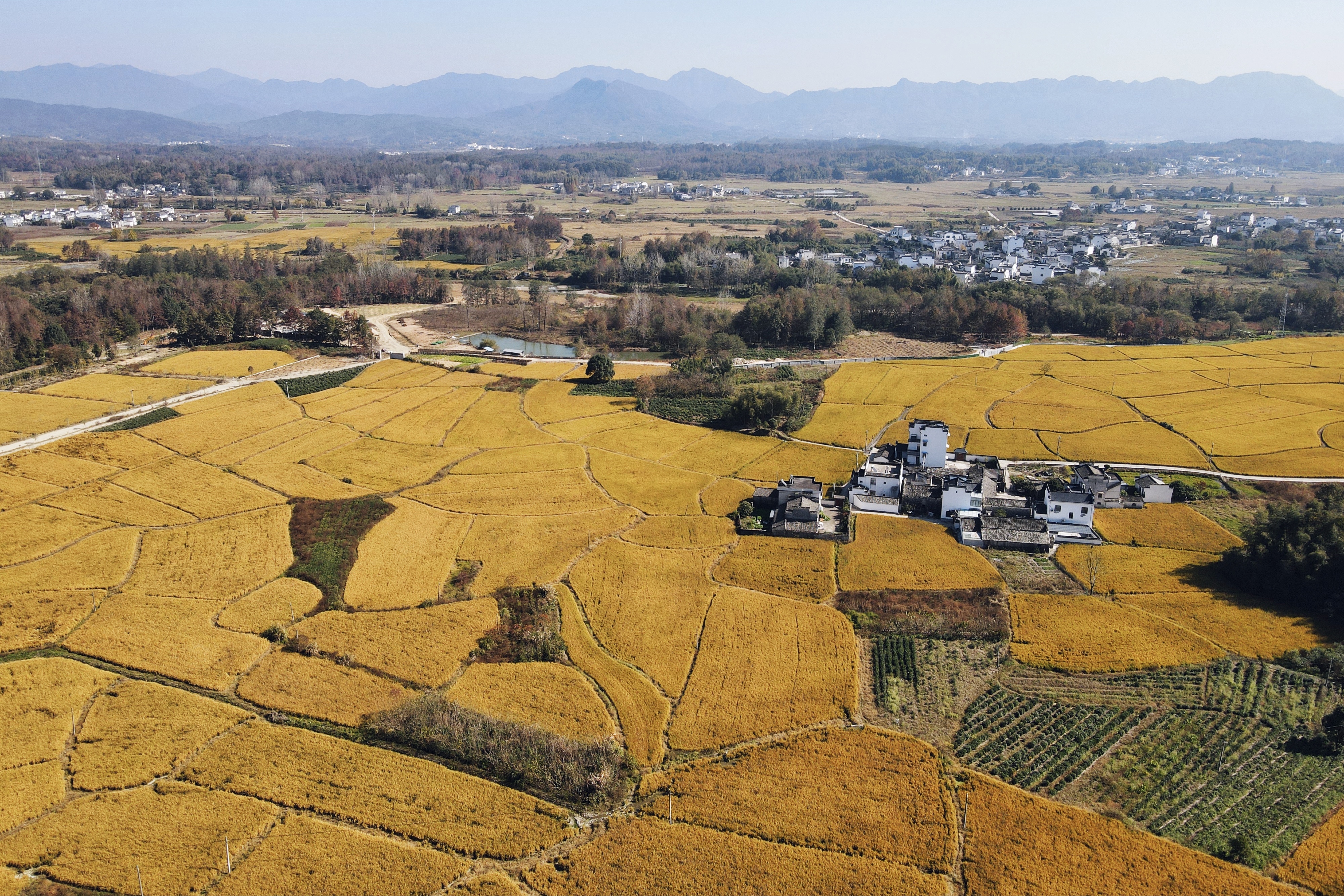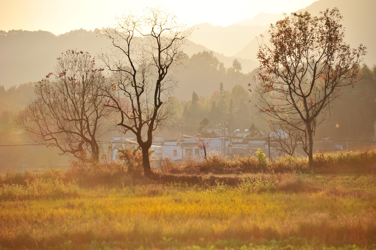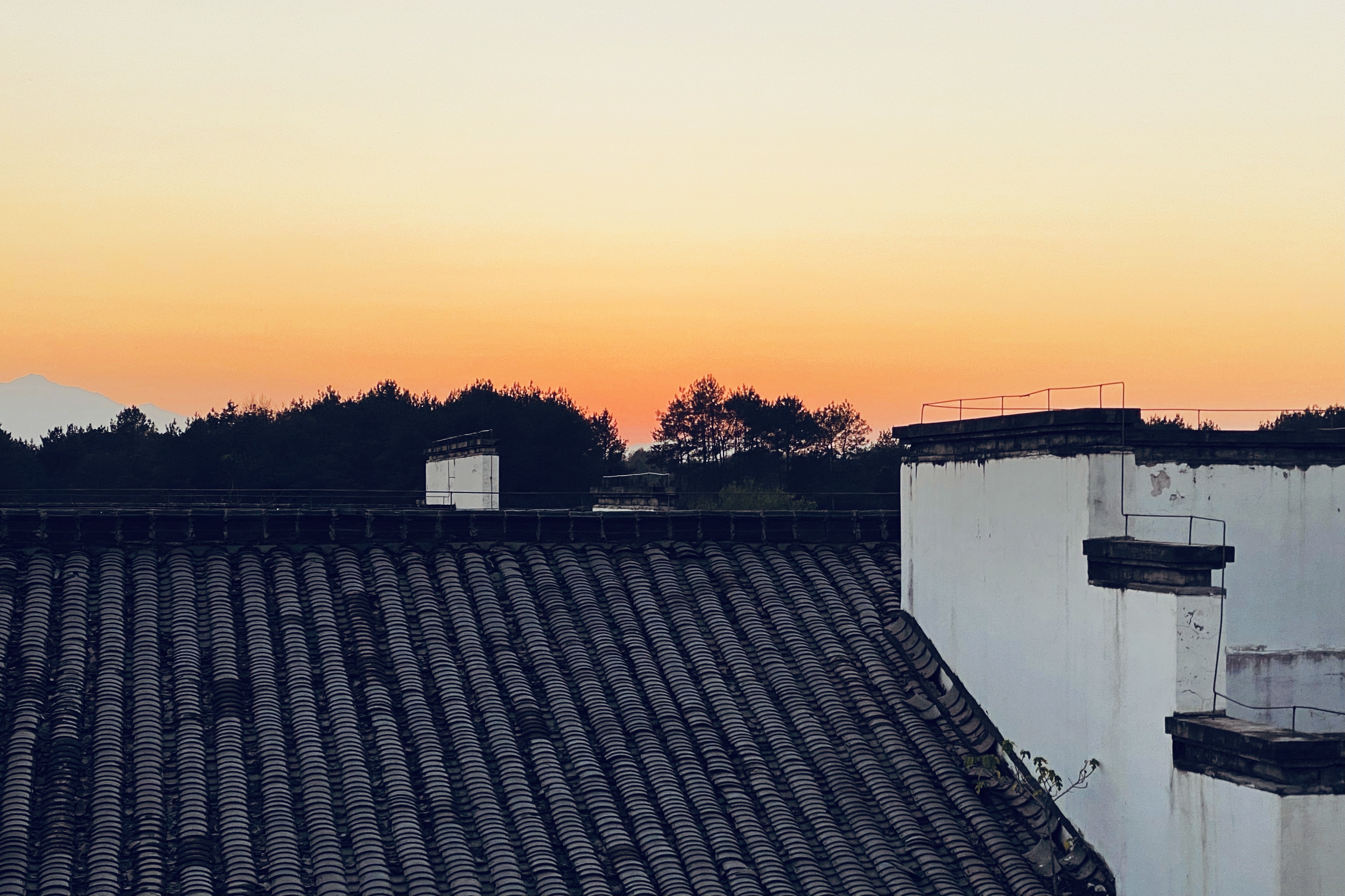 夕阳西下,登上阁楼,远山虚无缥缈,尽染的层林一片金黄,黄山雨润涵月楼尽收眼底。