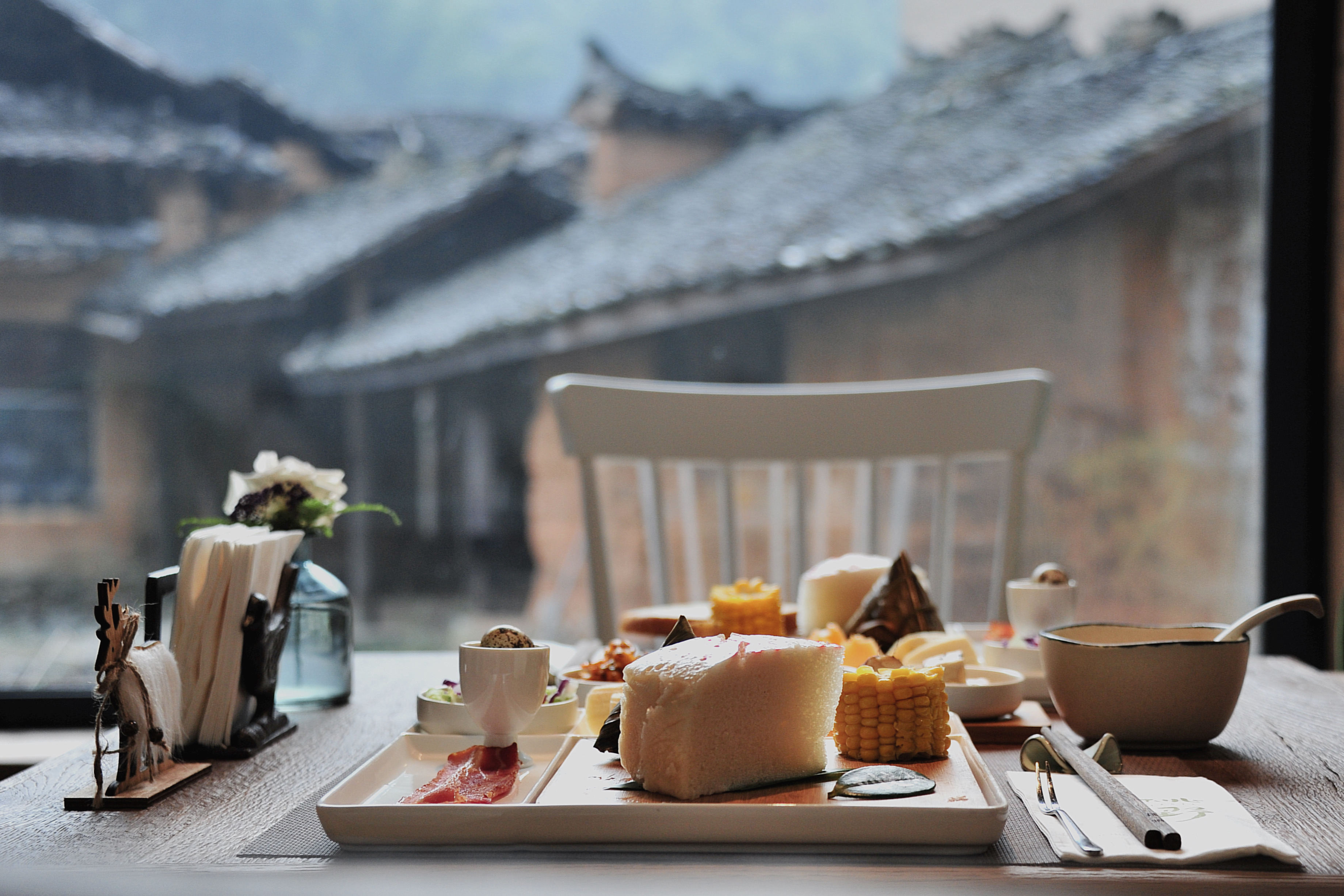 早餐采用定食,营养搭配合理。午餐选择套餐,蛋炒米果特别棒。晚餐可以尝尝小炒或火锅,味道都相当不错。松阳特色推荐米果,用豆荚烧灰活水,再将糯米泡在里面,就有了米果的黄色,可炒可煎,炒的糯,煎的外酥里嫩。还有一种叫不上名字的甜点也很特别,圆子外粘了厚厚的一层黑芝麻和糖粒,想想把黑芝麻汤圆里外翻过来就可以啦!