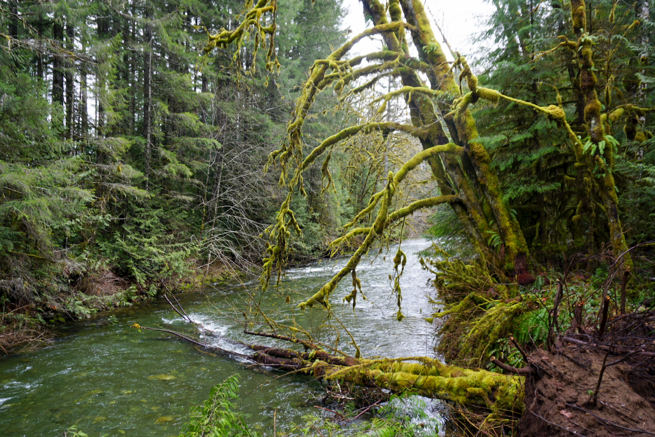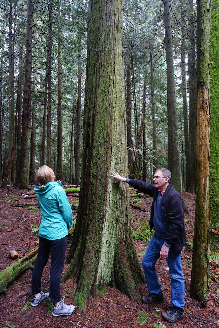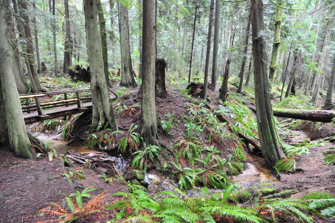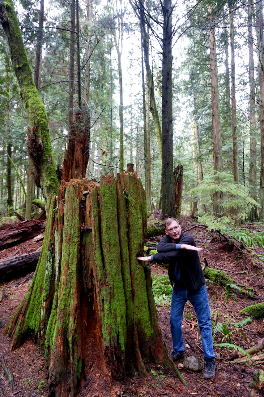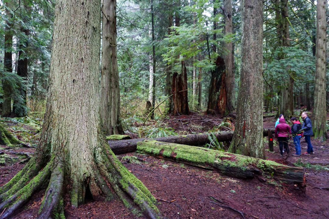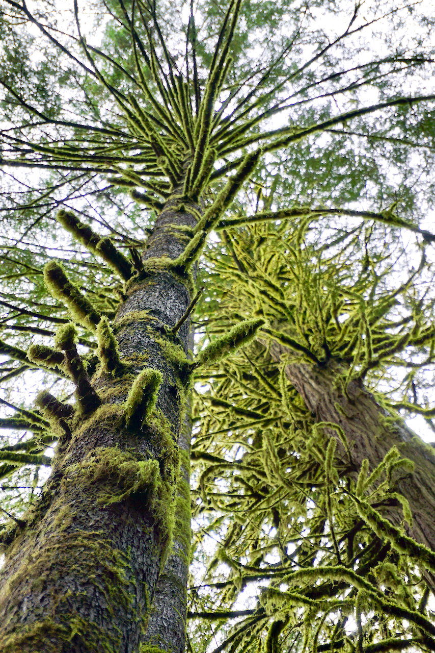 森林以加拿大西部红松和冷杉树为主,满眼都是它们笔挺的身姿,终年潮润给这些大块头们披上了一层绿绿的苔藓,那股柔软劲儿直让人想伸手去触摸。西部红松的根枝蔓出地表,通红的颜色甚是抢眼,而粗壮的断木上长出的寄生树,不得不让人感叹生命的顽强与奇迹。