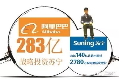 新闻主体:8月10日,阿里巴巴与苏宁云商签署协议,阿里将投资约283亿元人民币参与苏宁云商的非公开发行,占发行后总股本的19.99%,成为苏宁云商的第二大股东。与此同时,苏宁云商将以140亿人民币认购不超过2780万股的阿里巴巴新发行股份。