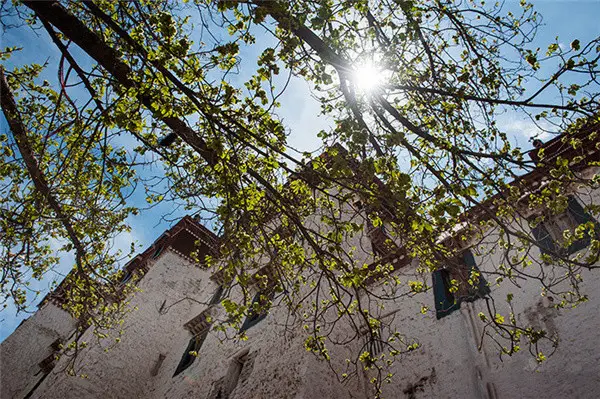 布达拉宫的一角,阳光灿烂,树影婆娑