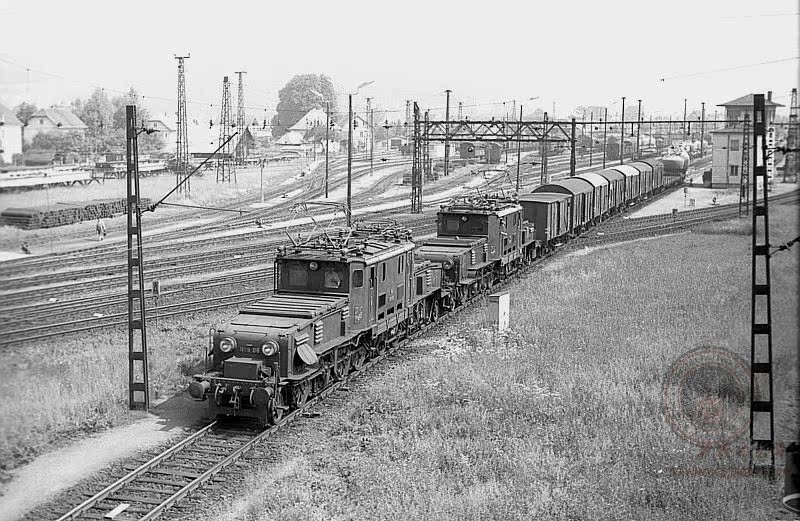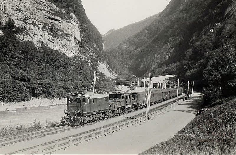 2、在萨尔斯山谷,鳄鱼和前面的这台D207重联,牵引一列客运车厢驶出山谷,这张图片,摄自1938年,女侠很想知道车厢里乘客的装束。
