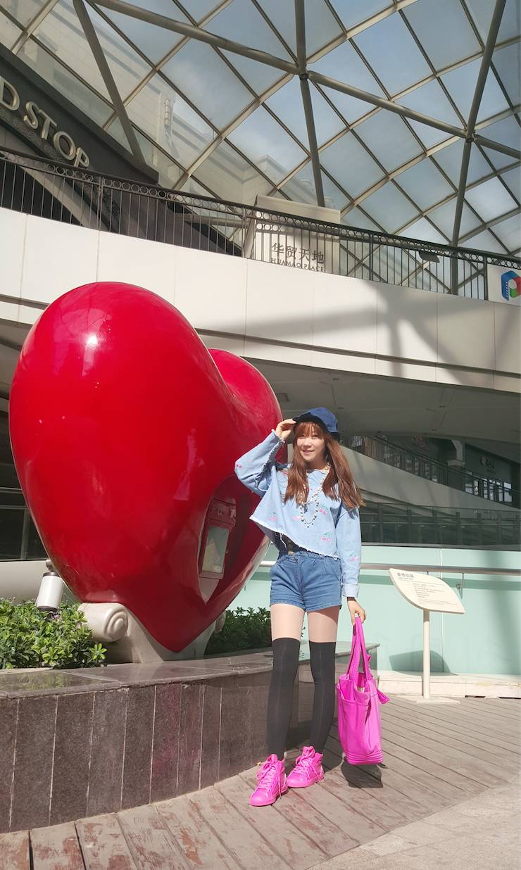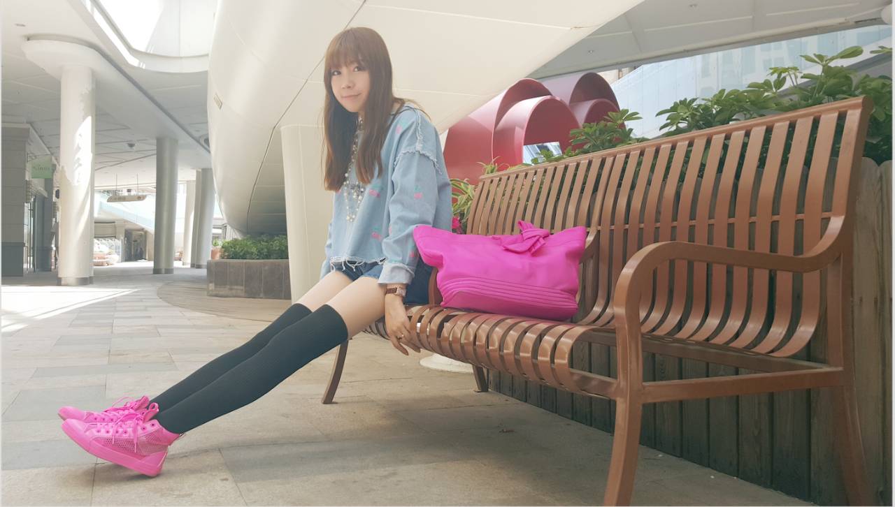 带上渔夫帽,深蓝的帽子和牛仔短裤相呼应,淡蓝色的宽松牛仔上衣上还有小花点缀。黑色的及膝袜搭配上桃红色球鞋,春天的气息扑面而来~