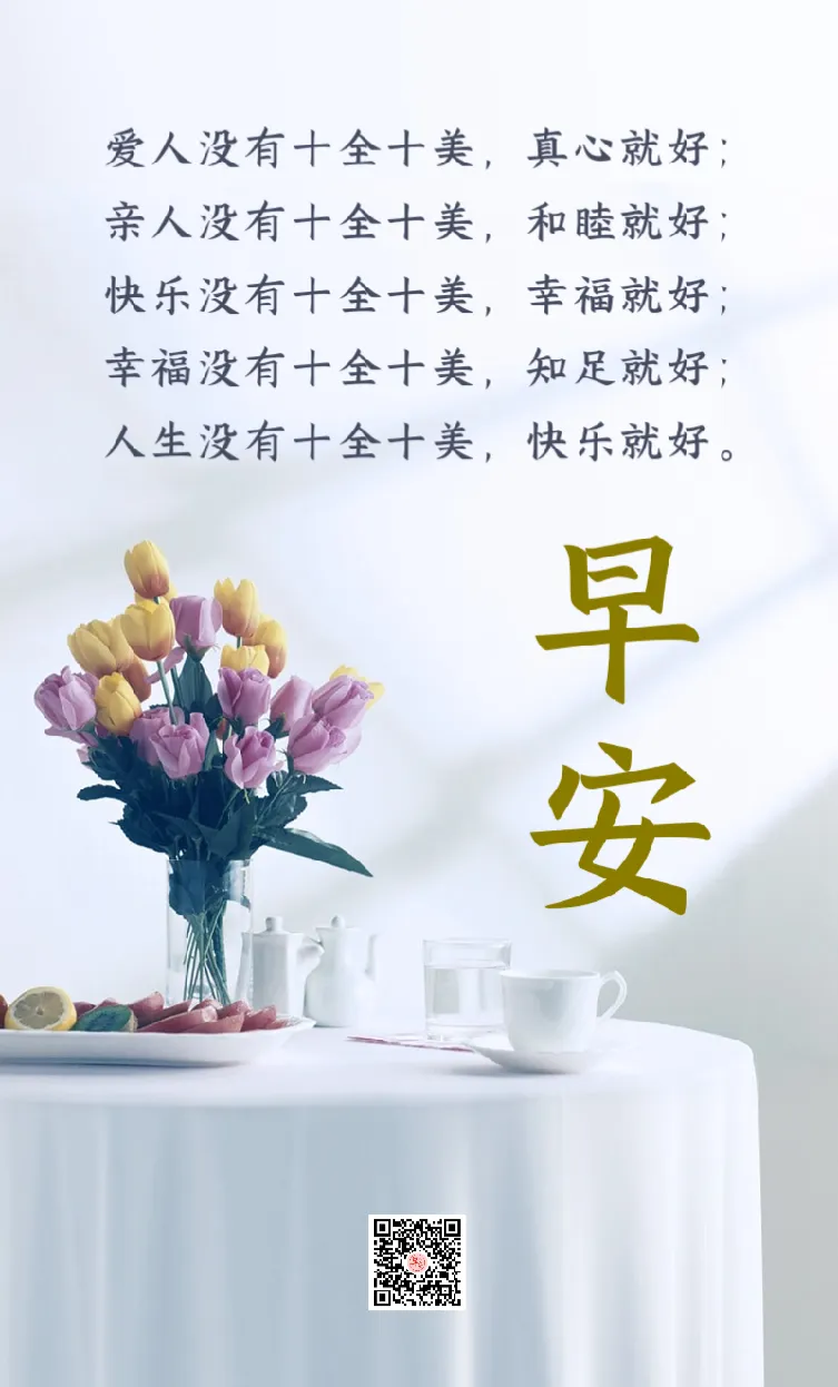爱人没有十全十美,真心就好;亲人没有十全十美,和睦就好;快乐没有十全十美,幸福就好;幸福没有十全十美,知足就好;人生没有十全十美,快乐就好。
