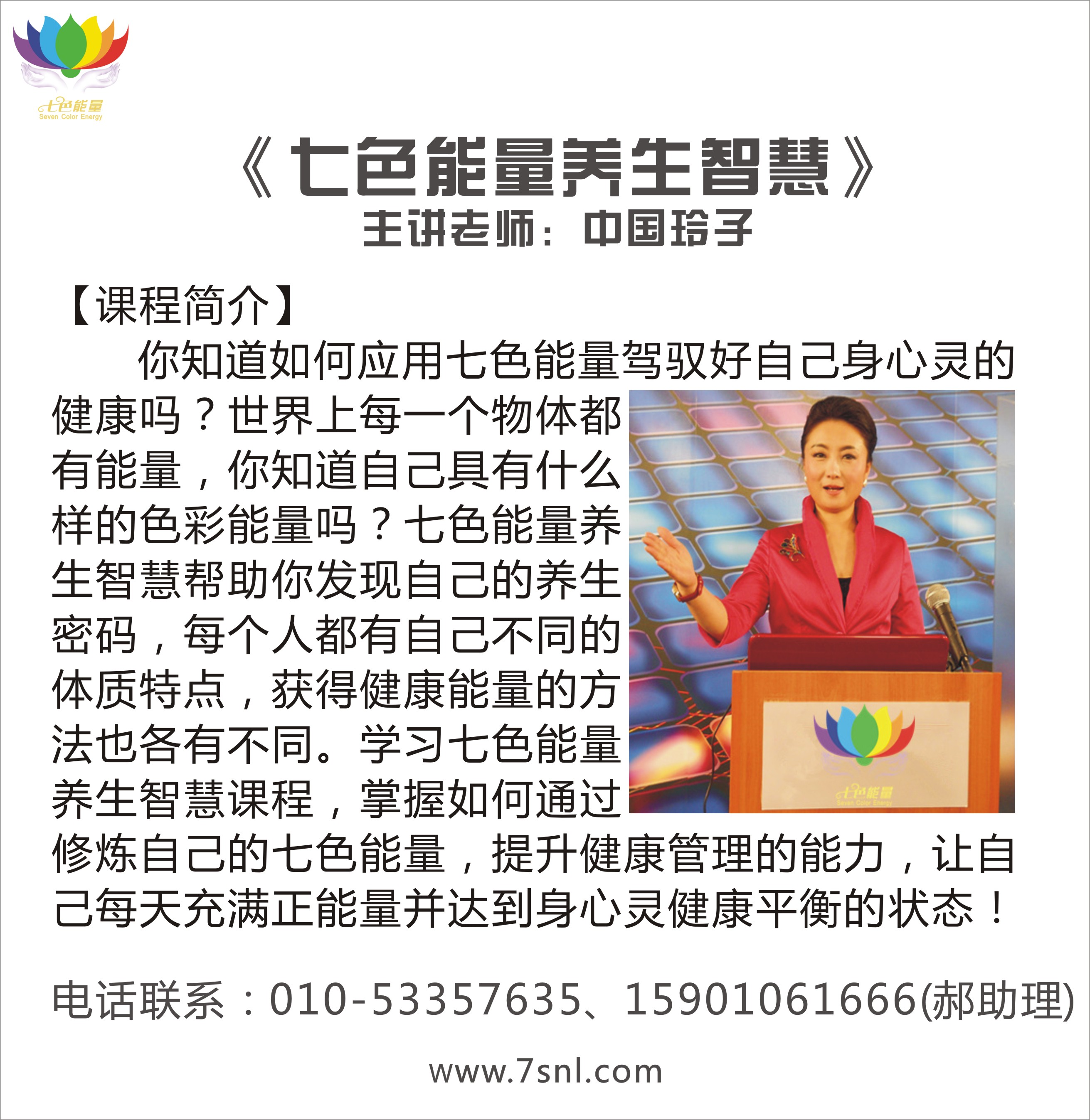 北京七色能量文化傳播公司,由七色能量创始人中国玲子女士领衔创办。中国玲子女士研究色彩能量16年,形象礼仪培训12年,是著名色彩能量导师、形象礼仪导师;曾荣获中国形象设计师大赛全国冠军、中国最佳形象礼仪导师、中国十强形象礼仪导师等称号。七色能量公司凝聚了国内外一批资深专家,专注形象礼仪、色彩能量培训;形象设计、色彩能量设计、色彩能量相关产品研发,旨在为更多人达成美丽富足的梦想,勇于超越自我,为使命传爱天下!