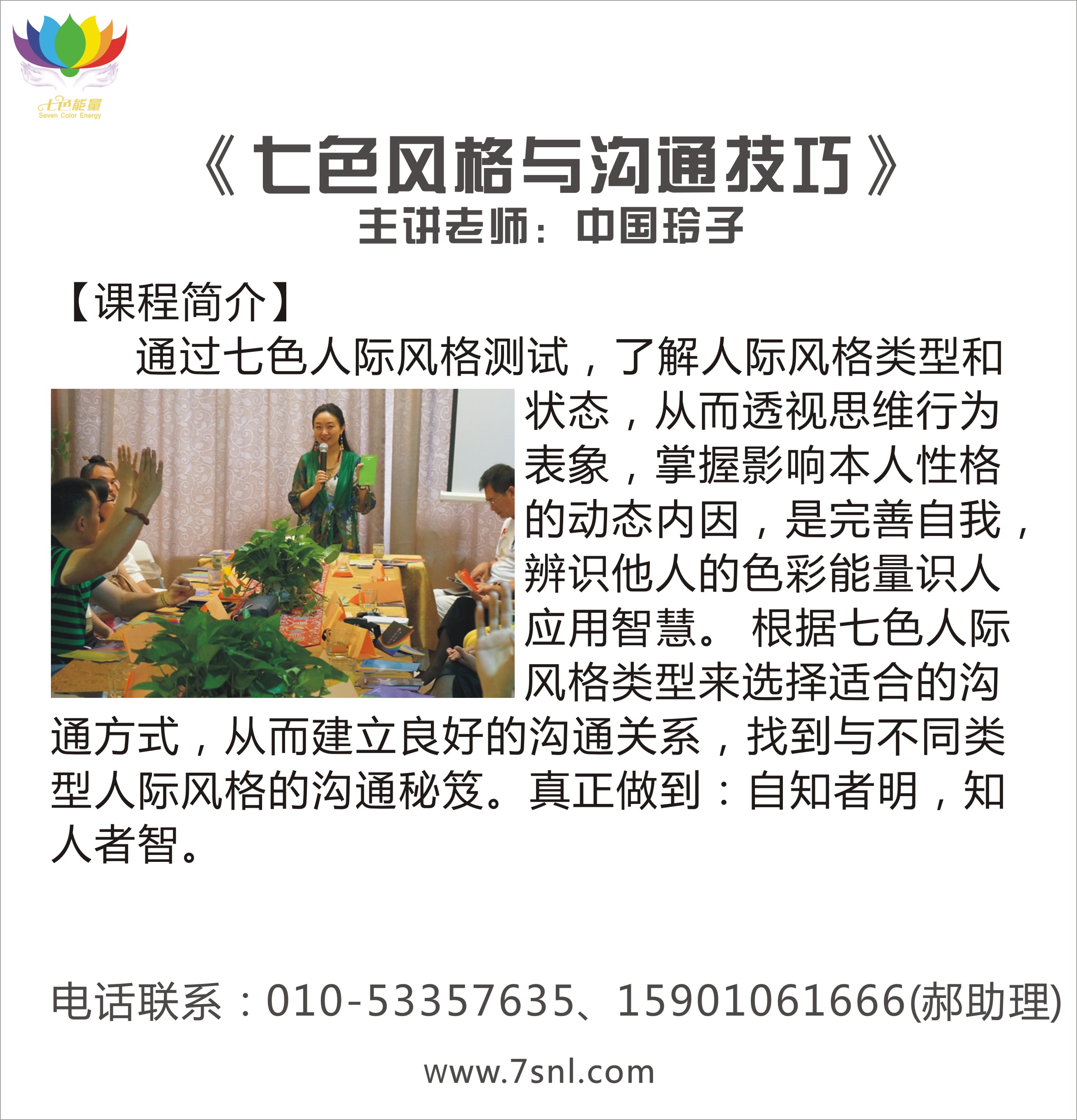 北京七色能量文化傳播公司,由七色能量创始人中国玲子女士领衔创办。中国玲子女士研究色彩能量16年,形象礼仪培训12年,是著名色彩能量导师、形象礼仪导师;曾荣获中国形象设计师大赛全国冠军、中国最佳形象礼仪导师、中国十强形象礼仪导师等称号。七色能量公司凝聚了国内外一批资深专家,专注形象礼仪、色彩能量培训;形象设计、色彩能量设计、色彩能量相关产品研发,旨在为更多人达成美丽富足的梦想,勇于超越自我,为使命传爱天下!