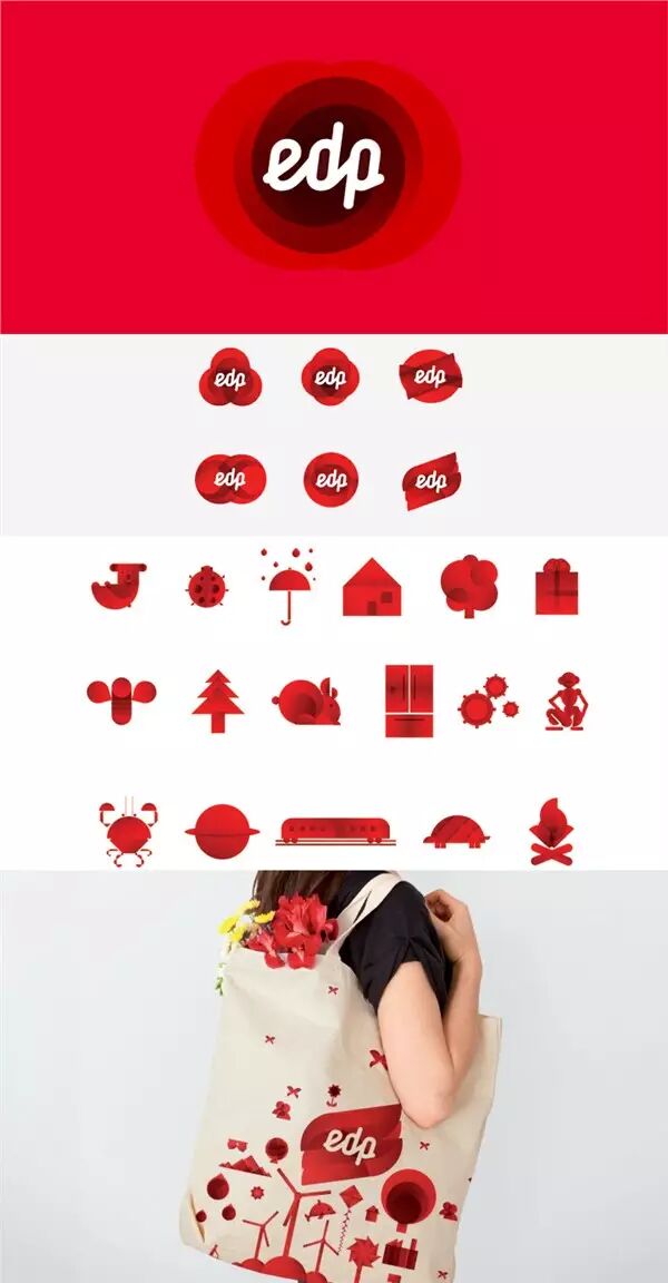EDP Energias是葡萄牙最大能源公司(http://www.edp.pt/en),新的形象由纽约的 Stefan Sagmeister 公司设计。将logo设计成动态变化的,在实际运用中色彩采取高亮的红和深色的红,不同亮度关系的红色随着变换的形状转变而相互叠加,形成有趣的图形。新的标识由七个基本形态组成,设计师还设计出了一系列图标,这些图标和新的标识一样,运用基本几何形,通过明度不同的红之间叠加而形成有趣的形象。