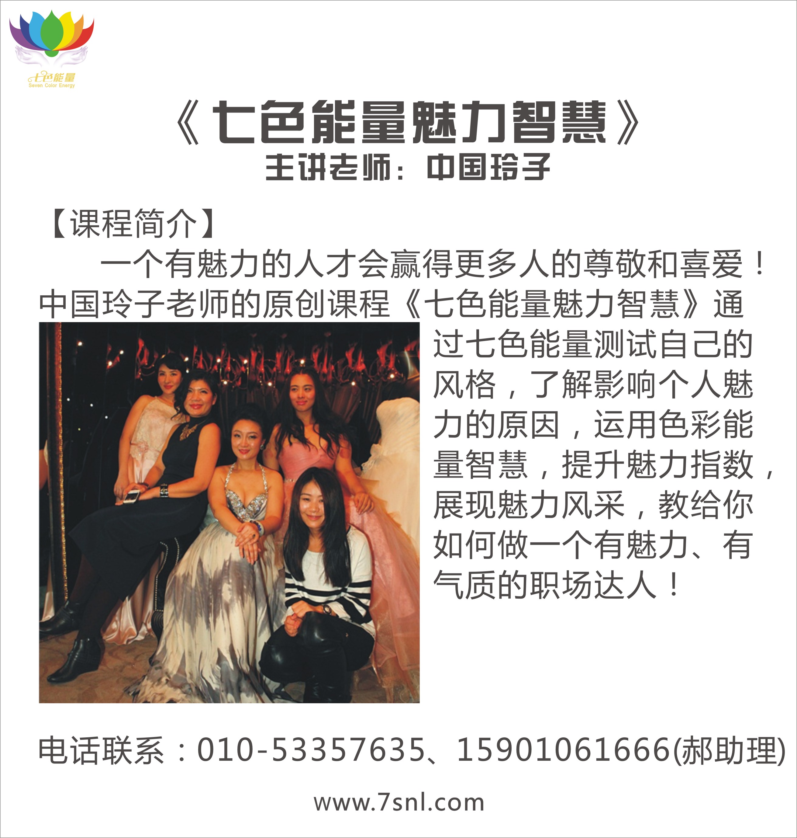北京七色能量文化傳播公司,由七色能量创始人中国玲子女士领衔创办。中国玲子女士研究色彩能量16年,形象礼仪培训12年,是著名色彩能量导师、形象礼仪导师;曾荣获中国形象设计师大赛全国冠军、中国最佳形象礼仪导师、中国十强形象礼仪导师等称号。七色能量公司凝聚了国内外一批资深专家,专注形象礼仪、色彩能量培训;形象设计、色彩能量设计、色彩能量相关产品研发,旨在为更多人达成美丽富足的梦想,勇于超越自我,为使命传爱天下!