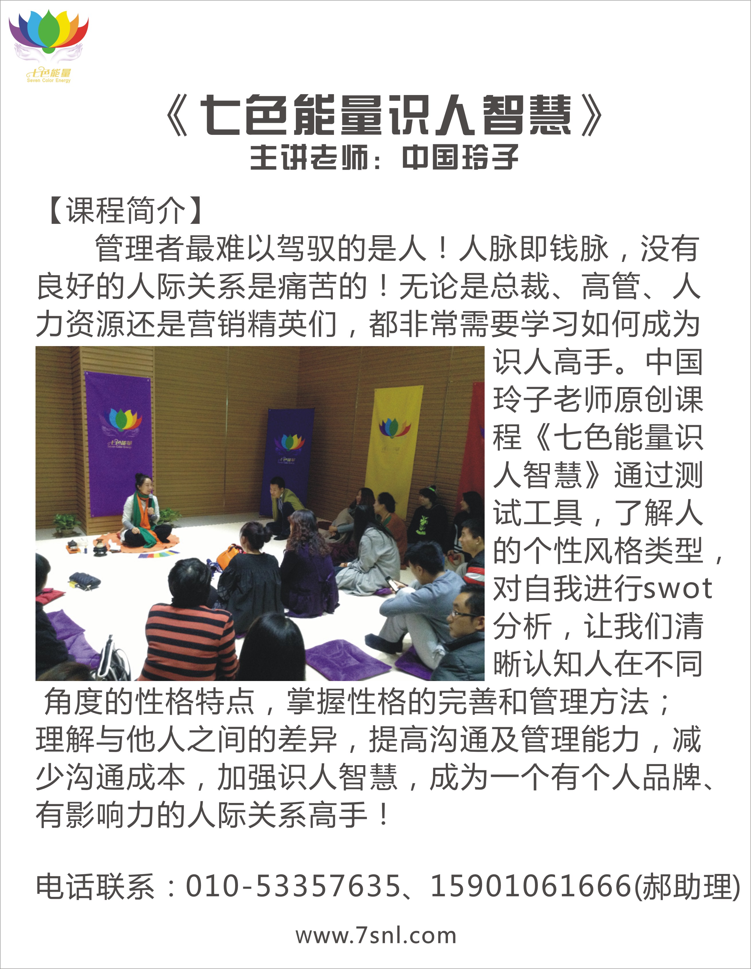 北京七色能量文化傳播公司,由七色能量创始人中国玲子女士领衔创办。中国玲子女士研究色彩能量16年,形象礼仪培训12年,是著名色彩能量导师、形象礼仪导师;曾荣获中国形象设计师大赛全国冠军、中国最佳形象礼仪导师、中国十强形象礼仪导师等称号。七色能量公司凝聚了国内外一批资深专家,专注形象礼仪、色彩能量培训;形象设计、色彩能量设计、色彩能量相关产品研发,旨在为更多人达成美丽富足的梦想,勇于超越自我,为使命传爱天下!