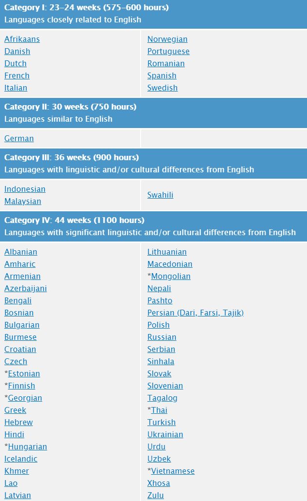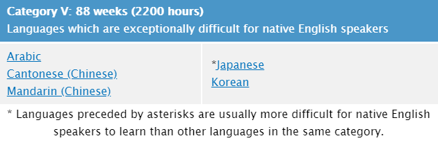 FSI就是美国的外国服务学院,一个培训外交官的机构,学员是以英语为母语的人士。伍教练查到了FSI发布的数据,发现是以英语母语人士为参照的,没有说英语本身的难度。最简单的1类语言需要学23-24周(575-600小时),都是一些接近英语的语言,例如荷兰语、西班牙语、葡萄牙语、法语、丹麦语、挪威语。最难学的5类语言需要学88周(2200小时),包括普通话、粤语、日语、韩语、阿拉伯语,还特别加*强调日语最难学。