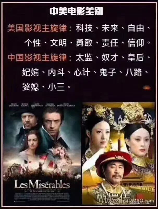 微信上热传的一个图用了《悲惨世界》的海报来对比“中美差别”,乍一看好像有些道理,不过我看了1300部英文电影,见过的负能量歪门邪道实在太多,《人体蜈蚣》之类就不说了,就根据《悲惨世界》这样的正能量大片也能给图片换一套说辞——