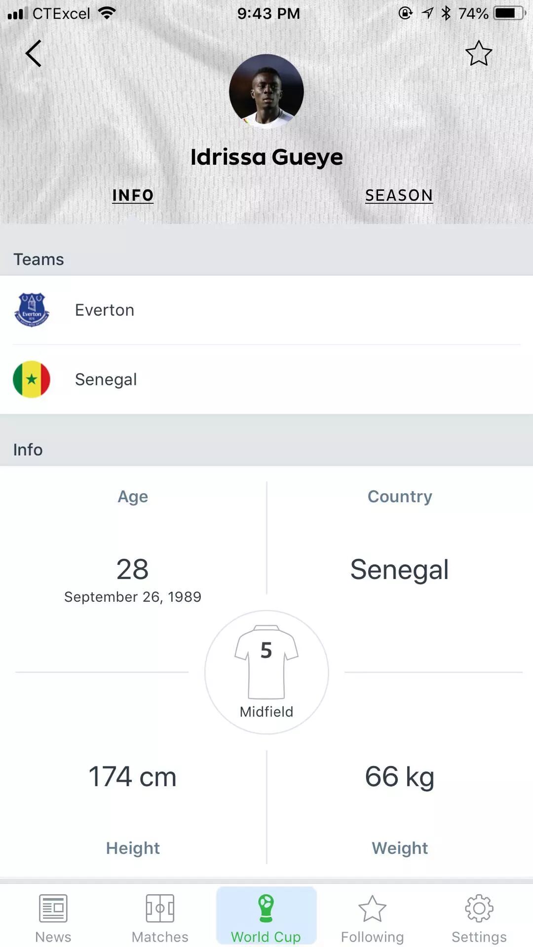 比较难听清楚的是人名。Lionel Messi、Cristiano Ronaldo的大名你也许经常听到,但塞内加尔的中场Idrissa Gueye听说过吗?(这哥们在哥伦比亚开角球的时候靠在门柱上歇着,结果被爆了。)不要紧,可以装个FIFA的官方app(系统语言可能要先设置English才有英文显示),随时更新场上情况,听到球员名字的发音之后在LINEUPS找人就是了,上面有球员的介绍和数据。专业的足球app Onefootball也可以,我两个都装了之后就天天推送个不停。我更喜欢用Onefootball,因为球员的名字显示较为完整,点开会有其所属俱乐部的信息。FIFA只显示一个名字,前面那位Idrissa Gueye居然只显示其中间的Gana,不方便快速找人,而且没有俱乐部信息。不过Onefootball不显示正在转会其间球员的俱乐部信息,例如瑞士名将Stephan Lichtsteiner,世界杯开赛前刚从尤文图斯转会阿森纳。