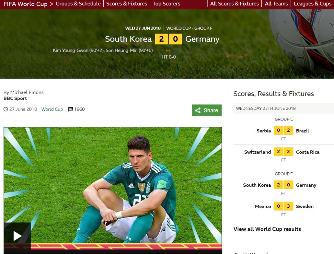 新闻:World Cup 2018: Germany out of tournament after losing to South Korea