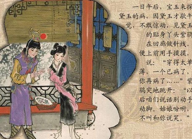 宝玉说自己就是死了,魂也要一日来一遭,问妹妹好不好,林黛玉又伤心了,不肯喝药,紫鹃说:“咳嗽的才好了些,又不吃药了。如今虽然是五月里,天气热,到底也该还小心些。大清早起,在这个潮地方站了半日,也该回去歇息歇息了。”