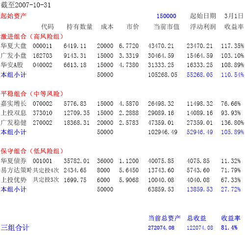 不知不觉10月就过去了,也该晒晒基金组合情况了,经过了10月的调整之后,整个组合从3月1日-10月31日的总收益情况是81%,托9月大幅上涨的福,总算依旧保持了每月10%。当然还是那句话,你完全没必要照搬整个组合,如果你喜欢高风险高回报,完全可以从中挑3个基金弄一个激进组合,目前没有暂停申购的应该可以包括:广发小盘、华安中国A和广发稳健吧:)