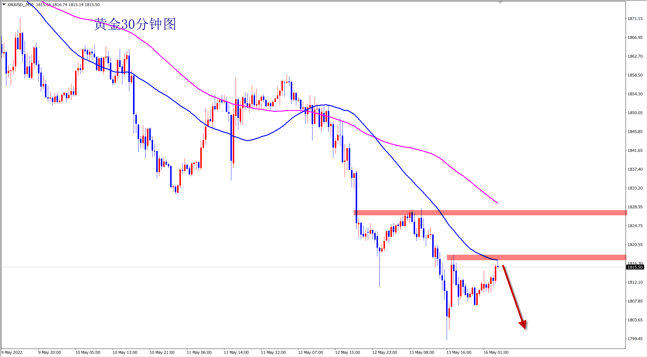 黄金趋势下跌行情,空头不止,跌势不止。顺势而为,一直是我们的核心操作原则,当前的黄金还是下跌的走势,反弹压力就是再次干空的机会!周五反弹遇阻的高点1825将是我们做空的防守,继续干空!
