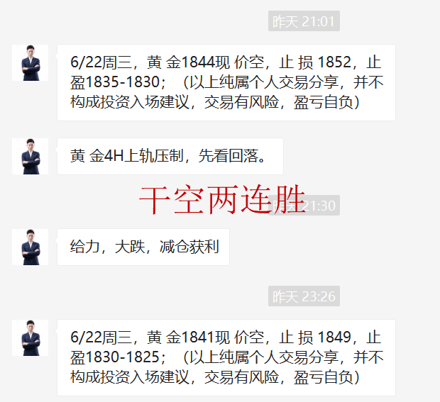 黄金昨日先跌后大涨,但是王杨并没有追多,而是分别在1844和1841位置干空,如期下跌,日内干空两连胜!当前行情没有突破1848压力前,继续高空!