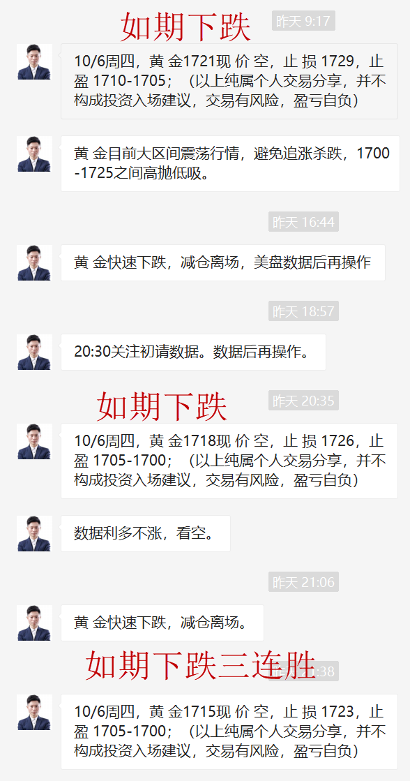 黄金昨日遇阻震荡下跌,王杨早盘1721位置干空,如期下跌获利,然后反弹1718继续空,再次下跌收割,美盘1715再次出手,空单下跌三连胜!今日黄金还是做空看跌不变,早盘依托1720的压力继续干空!