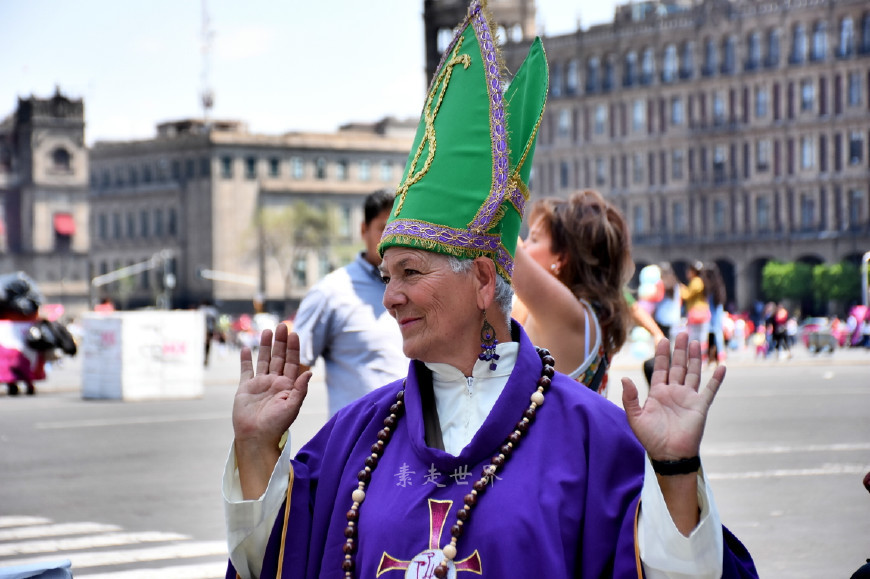 墨西哥城的宪法广场是永远的精彩部分,这里每天有着形式各异的街头艺术或一些节庆活动。这个女主教是第二次在这里见面了,记得上次见她是四年前第一次来墨西哥城,当时她身穿修女服饰手拿十了架却露出网眼丝袜的大腿,上演着一出疯狂修女的戏码。没想到第二次到墨西哥城临离开的前一天又见到她,可已经身着主教服饰了。