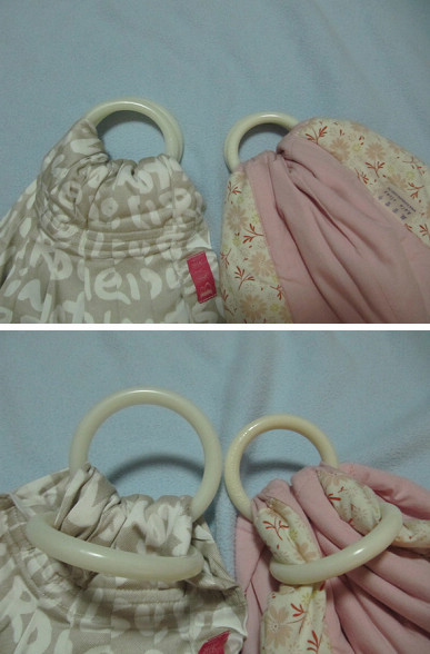 使用材质相同,但美人美心的环扣直径更大(前面有妈妈问我环扣的内直径,我量了一下,KOLA是5CM,美人美心是7CM),很多人说那样更方便操作,我倒是觉得小环扣布料扣得更紧一些。