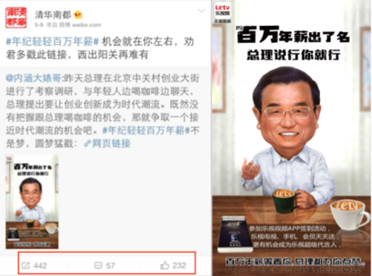 例如,乐视在话题传播的过程中,借势总理中关村跟年轻人谈梦想喝咖啡事件,对#年纪轻轻百万年薪#再次进行话题填充,制作人物漫画海报,并在漫画中植入乐视视频,吸引并保持受众对乐视视频百万年薪招募超级代言人活动的关注热度。