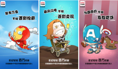 5.12复联在国内上线了,借势复联2在网络媒体上大量的曝光;为了从众多的借势营销中突围而出,乐视选择以“复二代”作为突破口,制作萌版漫画海报展现钢铁侠、雷神、美国队长二代形象,并以“不做复(富)二代”作为核心,呼吁用户争做百万年薪超级代言人。