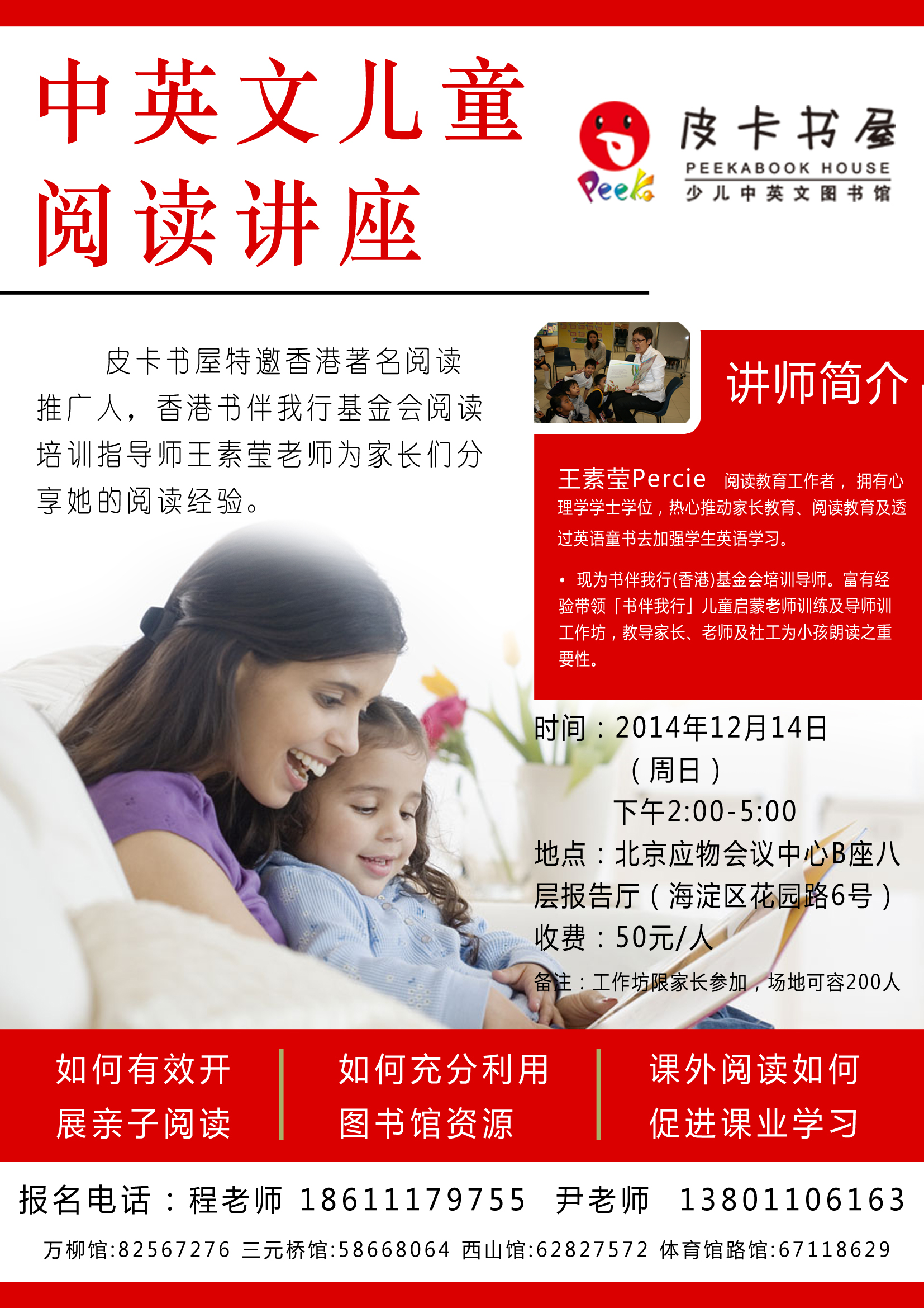皮卡书屋特邀香港“书伴我行”基金会培训师王素莹老师与北京地区的老师、家长们分享英语阅读指导、图书馆英语资源利用等精彩内容,期待大家热情参与。活动分为两场:第一场12月14日周日家长专场;第二场12月15日周一英语教师、绘本馆从业者、英语阅读推广老师专场。