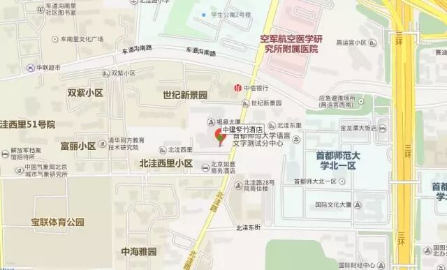 中建紫竹酒店(海淀区紫竹桥北洼西里12号,首都师范大学西侧)酒店电话:010—88515588