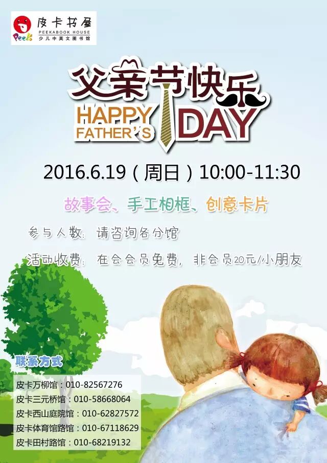 这个周日就是今年的父亲节,皮卡书屋各馆也为小朋友们和爸爸们准备了精彩的故事会,小朋友们要亲手制作精美的礼物送给爸爸,想收到礼物的爸爸一定要陪着小朋友们一起来参加活动哦!