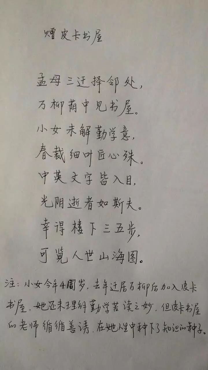 诗作《赠皮卡书屋》,其诗美,其情真,其字秀。这是皮卡书屋征文活动收到的家长诗作。皮卡书屋小会员的家长真是有才啊!感谢家长们对皮卡书屋的支持与热爱,让我们一起分享与皮卡书屋的故事吧。