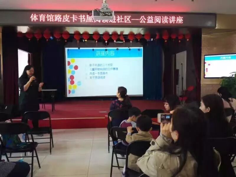 4月15日,在皮卡书屋体育馆路和街道安排下, 朱有琛老师来到东玉北街社区开设公益讲座。在本次讲座上,她与大家分享了亲子共读、儿童早期阅读、英语阅读方面的问题,现我们将讲座内容整理分享给大家,以弥补许多家长不能到现场聆听的缺憾。
