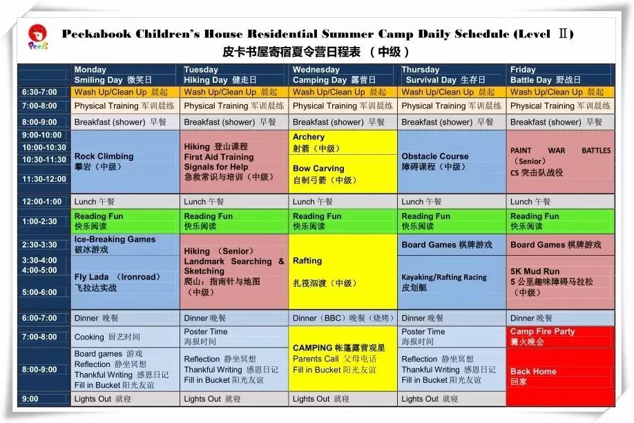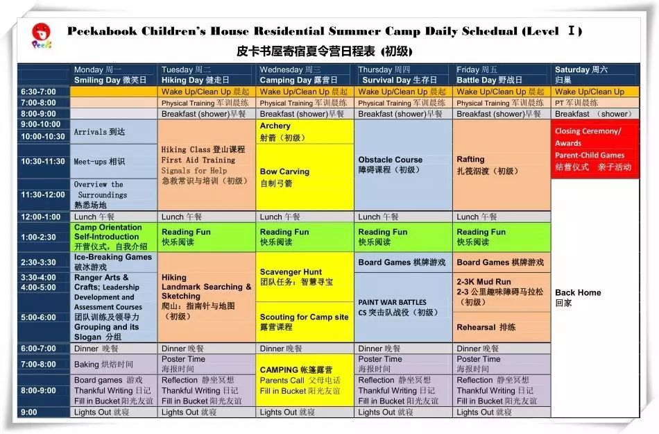 领导力培养:国际化的领袖力包括愿意服侍、善于观察、敏感于他人的需要并随时帮助、合理分配任务、锁定目标、解决问题、善于交流…本届寄宿营每个孩子都有机会做班长!我们会按照皮卡书屋的Leadership Assessment来引导并评析孩子们的领导力,使孩子们成为更加优秀的领袖。