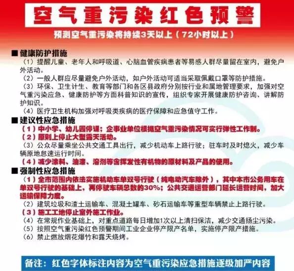 此前,我市已于12月7日0时启动了空气重污染橙色预警,各区、各单位动员部署,开展空气重污染应对工作。本次升级红色预警后,应急措施将有所加强,包括建议中小学、幼儿园停课;企事业单位根据空气重污染情况可实行弹性工作制;全市范围内将实施机动车单双号行驶(纯电动车除外),其中本市公务用车在单双号行驶的基础上,再停驶车辆总数的30%;公共交通运营部门将延长运营时间,加大运输保障力度;建筑垃圾和渣土运输车、混凝土罐车、砂石运输车等重型车辆禁止上路行驶;施工工地停止室外施工作业;增加道路清扫保洁;工业企业按红色预警停限产名单实施停产限产措施;禁止燃放烟花爆竹和露天烧烤。