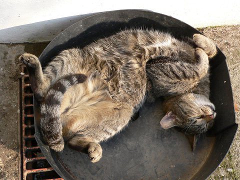 这是烧烤用的火盆吧 猫咪的柔韧性真的很强。