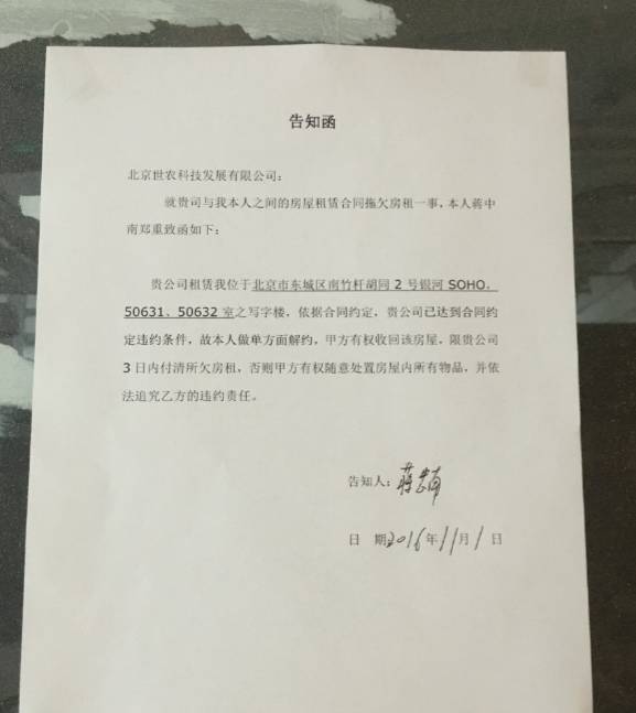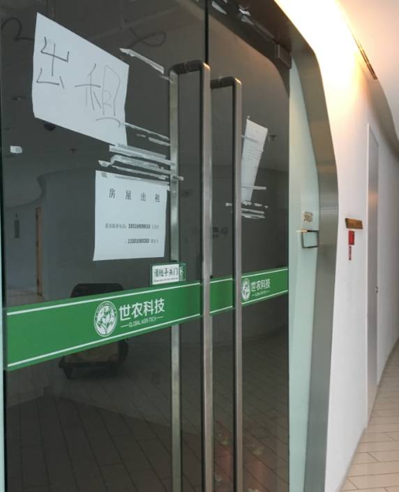 在D座6层,世农科技的两间办公室已被清空。玻璃门上贴着告知函,其公司因为拖欠房租,已经涉嫌违约。《凤凰周刊》2015年也曾报道,黑龙江省宝清县众多农户因种植由北京世农科技发展有限公司提供的所谓“超级水稻”稻种,而最终严重减产甚至颗粒无收的事件。北京世农科技发展有限公司的法人代表就是白志明。
