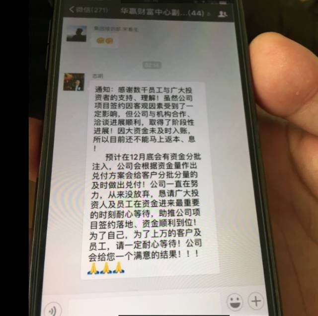 人群中的喧闹声并未停息。现场的华赢凯来负责人只好拿出手机给投资者们看华赢系高管微信群里白志明的一段话,“虽然公司项目签约因客观因素受到了一定影响,但公司与机构合作恰谈,取得阶段性进展!……预计12月底会有资金分批注入。”