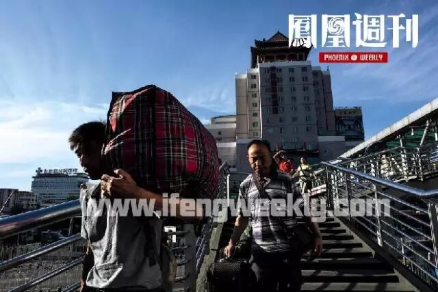2016年5月26日,农民工们从北京西客站前的过街天桥穿过,离开或来到北京打工。长期以来,经济发展的不均衡,导致大量农村劳动力涌入大城市寻找工作机会。国家统计局最新数据显示,截至2015年,中国农民工总数已达2.77亿人。