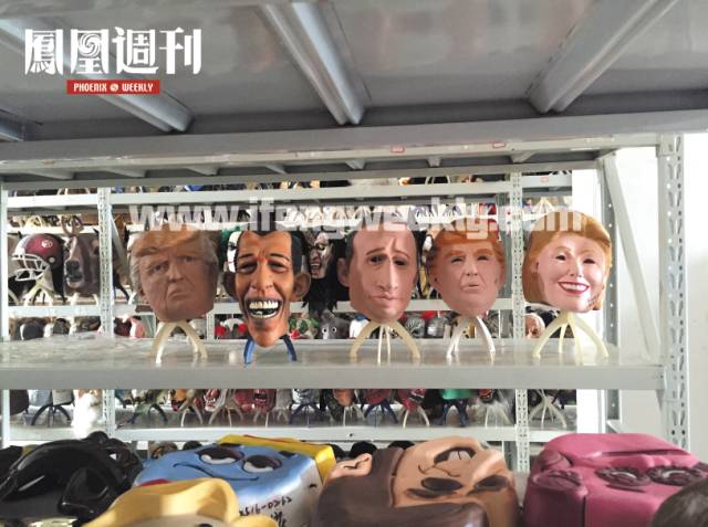 在金华派对的样品陈列室里,特朗普、奥巴马、普京、希拉里的面具在陈列架上一字排开。