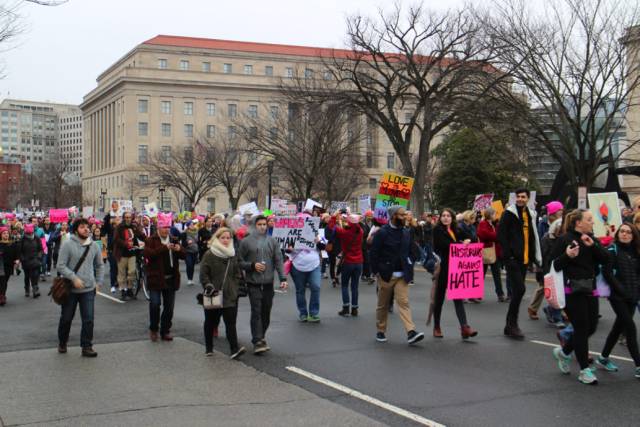 与往日冷清肃穆的华盛顿不同,今天靠近国家广场的街道到处都是成群结队的人,他们手里拿着旗帜、举着标语,多数人戴着粉红帽子或穿着粉红色的衣服。看到Katherine一行人还会大声打招呼,虽然大家互不相识,但她们知道大家的目的是一致的:去独立大道和第三大道的交界处参加华盛顿的“女性大游行”(Women’s March),为女性、少数族裔、同性恋等群体发声。