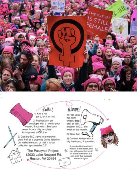 此次游行的标识——粉红色的猫耳帽,更体现了这次游行的“反特朗普”性质。这个帽子名为pussyhat,因为特朗普曾在一个泄漏的录音里炫耀自己可以“grab her by pussy(直接侵犯女生私处)”,而女生也不会说什么,“因为我是名人(celebrity)”。这次游行以此为由,用猫耳帽表示“pussy grab back(寓意女性要反击)”。