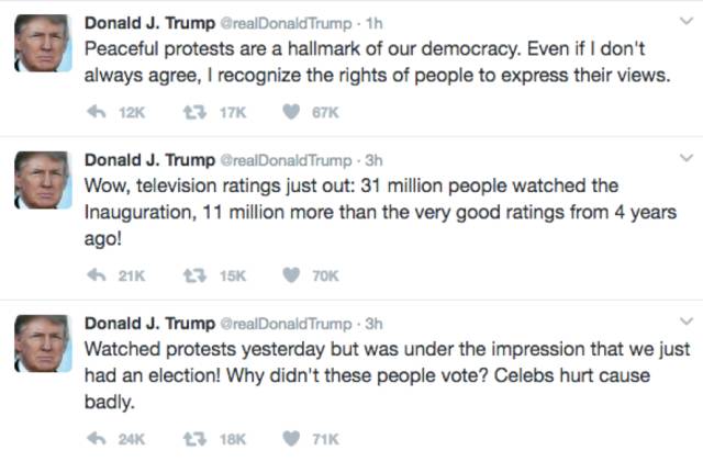面对汹涌的民意,1月22日上午,特朗普在一小时内连发三条推特表达自己的看法,较其之前的语气甚为缓和。从一开始的“看了昨天的抗议活动,感觉像是我们刚举行完一次选举!这些人为什么不投票?那些明星(的出现)扭曲了这个活动的初衷”到后来的“和平的抗议一直是我们国家民主的基石。即使我不是每次都同意(抗议的原因),但我尊重他们自由表达的权利”。但很难看出他是否会把抗议民众的诉求融入到未来的政策中。