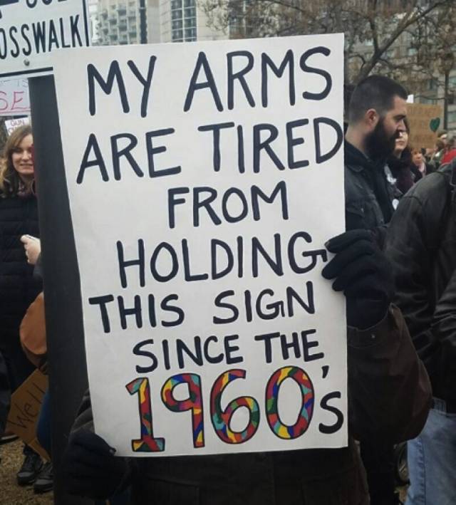 “我的双手从1960年代就开始举这些牌子,已经累死了!”借此讽刺美国的女性从那时为自己权益奋斗到现在,没想到还要继续。